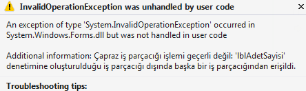 Additional information: Çapraz iş parçacığı işlemi geçerli değil: ‘lblAdetSayisi’ denetimine oluşturulduğu iş parçacığı dışında başka bir iş parçacığından erişildi.