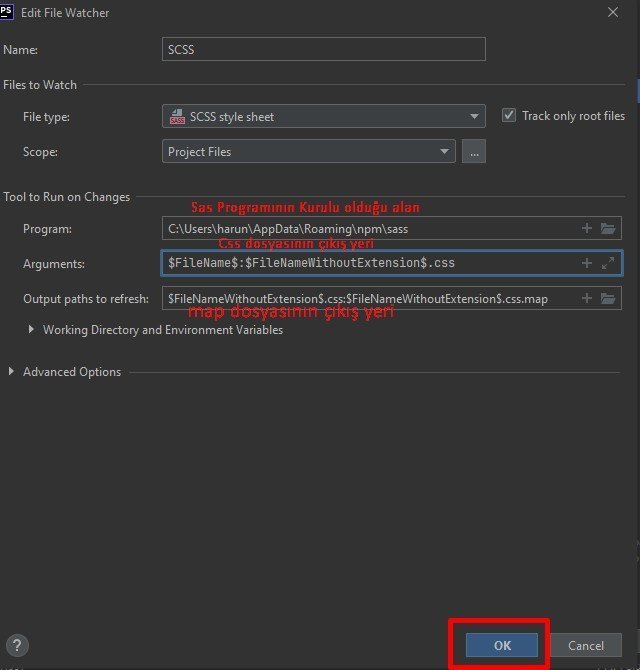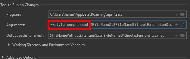 ***Not Eğer çıkan css dosyasın küçültülmüş olarak çıkmasını istersek argument kısmına aşağıdaki kodu yazdığımızda css dosyamız sıkıştırılmış olarak çıkacaktır.