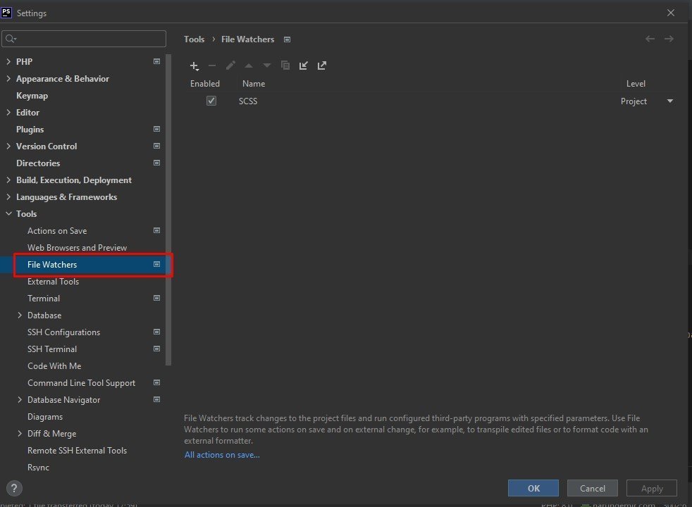 Phpstorm açıp Ctrl+Alt+S tuş kombinasyonu ile ayarları açıyoruz. File Watchers yazan kısma tıklıyoruz.