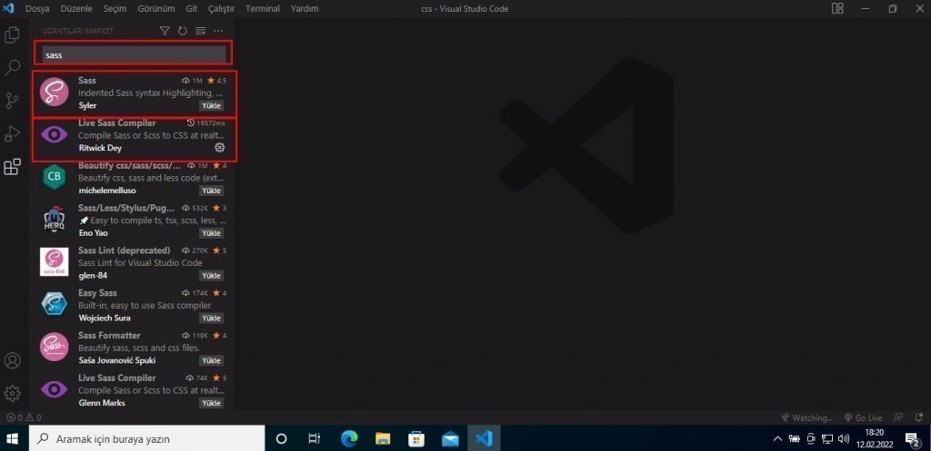 Aşağıdaki görselde görüldüğü gibi arama kısmına “sass” yazıyoruz ve ilk sırada çıkan Sass ve altındaki Live Sass Compiler eklentilerini yüklüyoruz.