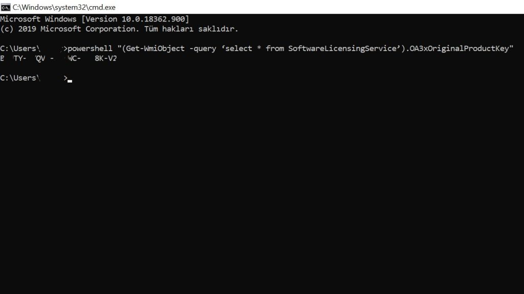 - powershell “(Get-WmiObject -query ‘select * from SoftwareLicensingService’).OA3xOriginalProductKey”