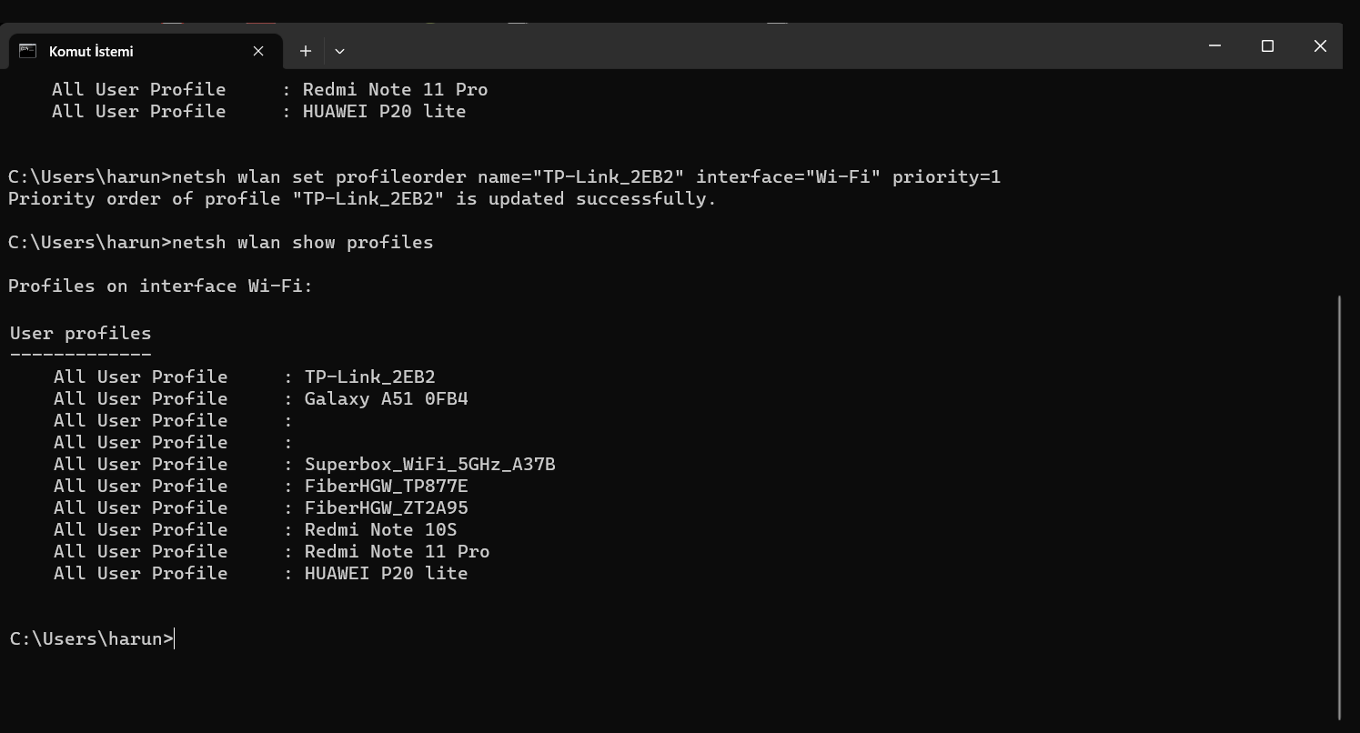 Bu komut, bilgisayarınıza kaydedilmiş Wi-Fi ağ profillerini listeler ve bu ağların öncelik sıralamasını gösterir.