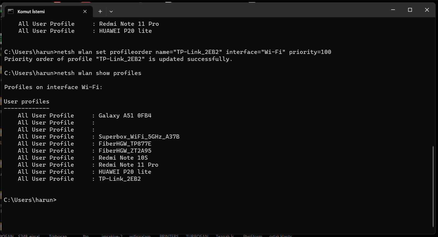 Örneğin, bir Wi-Fi ağı profil adını “TP-Link_2EB2” olarak ve arayüz adını “Wi-Fi” olarak belirlediğinizi varsayalım. Bu ağı önceliği listenin en üstüne taşımak için aşağıdaki komutu kullanabilirsiniz: